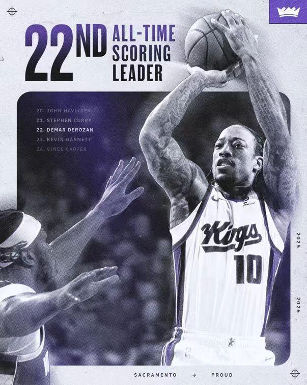 德羅贊NBA生涯常規(guī)賽總分超越加內(nèi)特26071分,升至NBA歷史得分榜第22位迎來里程碑。