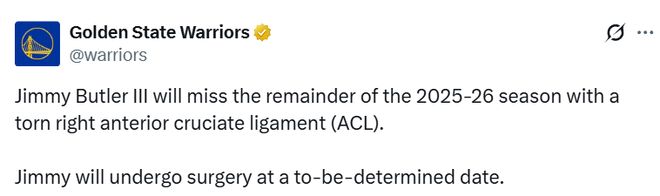 北京時間1月21日,勇士官方發(fā)布聲明,前鋒吉米-巴特勒因右膝前交叉韌帶撕裂,將缺席2025-26賽季的剩余所有比賽。巴特勒是在昨日對陣邁阿密熱火的比賽第三節(jié)還剩7分41秒時受傷的,勇士隊最終以135-112獲勝。他將在擇期接受手術(shù)。
