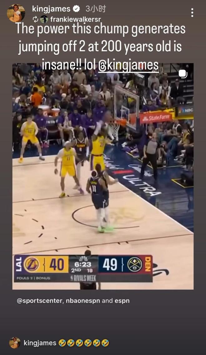 北京時(shí)間1月22日,詹姆斯在IG社媒上轉(zhuǎn)發(fā)了朋友的動(dòng)態(tài)。他的朋友曬出詹姆斯在對(duì)陣掘金比賽中的扣籃畫面,并配文寫道:“這老家伙都200歲了,還能雙腳起跳爆發(fā)出這么恐怖的力量,太離譜了!”詹姆斯轉(zhuǎn)發(fā)時(shí)也配上了6個(gè)笑哭了的表情。