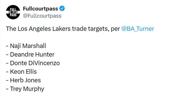 湖人隊記布拉德-特納撰文稱:“據多位NBA內部人士透露,與湖人隊傳出緋聞的潛在引援目標包括達拉斯獨行俠隊的納吉-馬紹爾——他曾是東契奇的隊友,此外還有克利夫蘭騎士隊的德安德烈-亨特、明尼蘇達森林狼隊的唐特-迪文琴佐以及薩克拉門托國王隊的基翁-埃利斯。新奧爾良鵜鶘隊的特雷-墨菲三世和赫伯特-瓊斯也是湖人表現(xiàn)出興趣的兩名球員,聯(lián)盟中多支球隊同樣對他們有意。不過據NBA消息人士透露,鵜鶘對這兩人的要價極高,各隊都在觀望,等待其在下周交易截止日前是否會降低籌碼?!?/p>