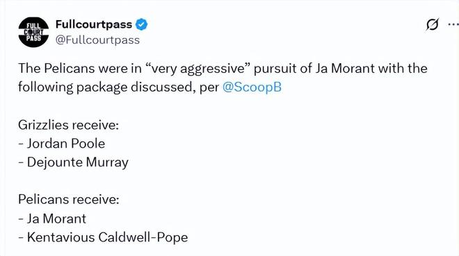 然而,鵜鶘隊(duì)卻寸步不讓。新奧爾良方面不愿為任何一套交易方案附加選秀權(quán),他們認(rèn)為送出的球員籌碼已經(jīng)足以匹配莫蘭特的身價(jià)。當(dāng)灰熊隊(duì)提出首輪簽的硬性要求時(shí),鵜鶘目前給出了 “拒絕” 的答復(fù)。