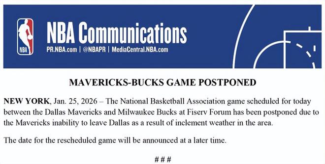 另外,根據(jù)原定賽程,密爾沃基雄鹿隊將于北京時間今日上午8點主場迎戰(zhàn)獨行俠隊,然而獨行俠隊于當(dāng)?shù)貢r間周六晚間未能順利飛抵密爾沃基。目前,球隊仍滯留達(dá)拉斯。NBA同樣官方宣布,本場比賽因惡劣天氣原因,比賽延期舉行,補賽日期將另行公布。