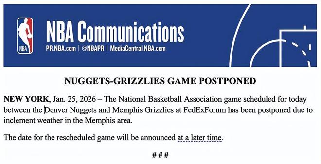 NBA官方在比賽開球前不到三小時發(fā)布公告稱,鑒于孟菲斯地區(qū)的惡劣天氣狀況,本場比賽將擇期重賽。該地區(qū)自當(dāng)?shù)貢r間周六清晨起便持續(xù)遭遇雨夾雪和凍雨天氣,且降雪、凍雨交織的狀況一直延續(xù)至周日上午。掘金與灰熊兩隊球員及本場執(zhí)法裁判組均已抵達(dá)孟菲斯,但比賽最終還是延期舉行。