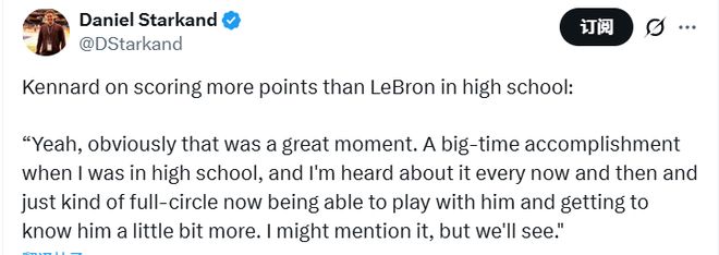 有美媒報道,肯納德高中生涯得到2977分,甚至高于詹姆斯的高中生涯(2657分)。談及高中時期得分比詹姆斯多,肯納德表示:“當然,那是段超棒的回憶,也是我高中時的一大成就。直到現(xiàn)在偶爾還會有人提起這事,如今能和他并肩作戰(zhàn)、慢慢更了解他,感覺一切都很圓滿。我或許會跟他提提這事,不過看情況吧。”