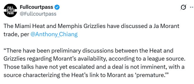 北京時(shí)間1月15日,據(jù)熱火隊(duì)記Anthony Chiang報(bào)道,熱火與灰熊之間已就莫蘭特的交易可能性進(jìn)行瞭初步談判。不過這些談判尚未升級(jí),交易也並非迫在眉睫,有消息人士稱熱火與莫蘭特的關(guān)聯(lián)還“為時(shí)過早”。