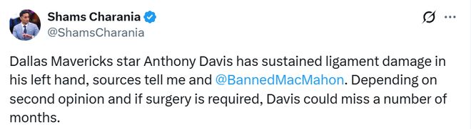 北京時(shí)間1月10日,據(jù)名記Shams報(bào)道,達(dá)拉斯獨(dú)行俠球星安東尼-戴維斯左手韌帶遭遇損傷。根據(jù)二次診斷結(jié)果以及是否需要接受手術(shù),戴維斯可能缺席長(zhǎng)達(dá)數(shù)月的比賽。