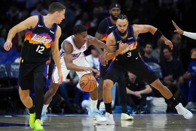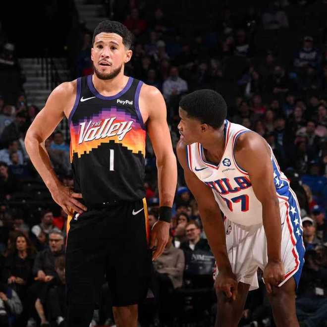 次節(jié)比賽,太陽進(jìn)攻火力提升首次單節(jié)30分,且限制76人首次單節(jié)不足25分。太陽被拉開29-34落后,太陽內(nèi)外開花一波12-2攻勢反超5分,76人回敬一波7-0攻勢奪回領(lǐng)先。太陽內(nèi)外開花重新以46-45反超比分,雙方之后持續(xù)緊咬比分纏斗至53-53,太陽連得4分,太陽單節(jié)30-23凈勝7分,上半場結(jié)束太陽57-53反超76人。前兩節(jié)比賽,太陽三分15中6,布克13分與伊戈達(dá)羅10分;76人三分20中6,埃奇庫姆12分與烏布雷16分。