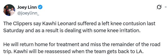萊昂納德將會缺席快船周二客場對陣奇才、周三客場對陣公牛的兩場比賽,他的傷情復查將安排在快船主場迎戰(zhàn)湖人的比賽之前。