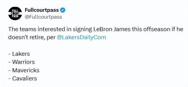 北京時(shí)間1月31日,據(jù)《湖人日?qǐng)?bào)》消息人士透露,若勒布朗-詹姆斯不在本賽季休賽期退役,這位未來的名人堂成員將會(huì)收到四支球隊(duì)的追逐邀約。