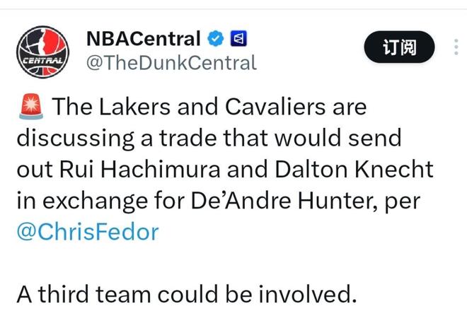 費(fèi)多爾表示:“據(jù)我得到的消息,騎士與湖人已就德安德烈-亨特的交易搭建初步框架,交易主體為八村壘和道爾頓-克內(nèi)克特,同時雙方還計劃引入第三方球隊(duì)參與交易?!?/p>