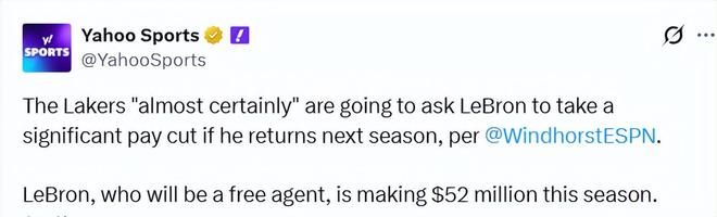 名記文霍斯特表示:“賽季結(jié)束后——無論湖人的賽季何時落幕——詹姆斯都要面臨兩個重大抉擇。第一,他是否要再打一個賽季。而他的態(tài)度也很明確,他自己目前也沒有答案,對此我是相信的。第二,如果他決定再戰(zhàn),他愿意接受多少薪資。因為湖人幾乎肯定會要求他降薪,而且幅度可能還不小。”