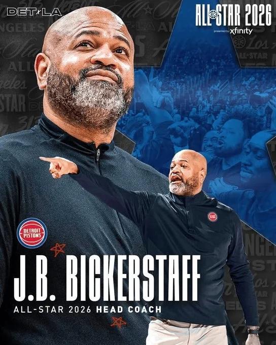 活塞官方曬出海報祝賀比克斯塔夫,同時配文寫道:“比克斯塔夫?qū)⒄綋?dān)任26年NBA全明星賽主教練!”