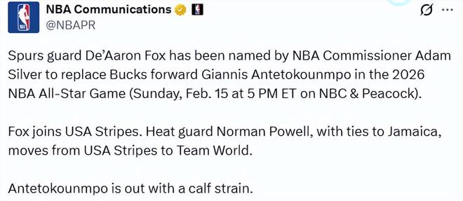 聯(lián)盟官方宣布,馬刺后衛(wèi)德阿隆-福克斯被總裁亞當(dāng)-蕭華選為替補(bǔ)人選,但他不會(huì)加入世界隊(duì),而是代表美國(guó)條紋隊(duì)出戰(zhàn);熱火球員諾曼-鮑威爾將被調(diào)整至世界隊(duì),他與牙買加有淵源。